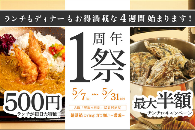 大阪 堺筋本町駅にある活貝居酒屋『焼蒸鍋Dining おうめい-嚶鳴-』では、2024年5月7日(火)~5月31日(金)まで、昼も夜もお得になる1周年記念イベントを開催いたします。