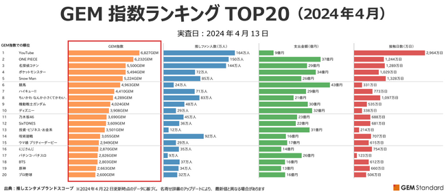 「推しエンタメブランドスコープ」では、市場におけるコンテンツファンの広がり(推しファン人数)と深さ(支出金額と接触日数で測られる関与度)から、エンタメブランドの価値を測る総合指標「GEM指数」を算出しています。2024年4月の「GEM指数」ランキングTOP20は下記赤枠となりました。