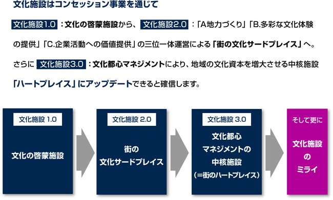 「文化施設」を中心にして、「文化」に関する「エコシステム」と「社会実装」とを両立させる仕組みづくりで、文化施設は「文化都心マネジメントの中核施設(=街のハートプレイス)」として位置付けられます。