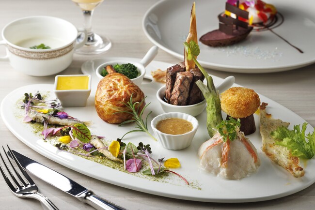 今回は、夏を迎える伊豆半島を巡るミニコースディナーをご用意いたしました。メインディッシュは伊豆の魅力を少しずつ楽しめる山海プレート仕立てでご提供。静岡みかんのソースでさっぱりといただける赤富士に見立てた金目鯛のポーピエット、一級河川・狩野川の鮎のエスカベッシュ、天城椎茸を使用した椎茸クロケット、駿河湾の桜海老としらすのガレットなど、伊豆の魅力を詰め込みました。デザートには下田に来航した黒船と白浜に打ち上がる花火をチョコタルトと3色アイス、エディブルフラワーで表現しました。お食事と共に、月ヶ瀬梅シロップと甘酒ベースのカクテル「プラムスイート」をお楽しみください。【メニュー】