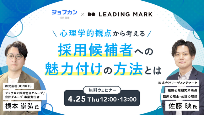 Personality Techを通じたHR事業「ミキワメ」を提供する株式会社リーディングマークは、バックオフィス支援クラウド「ジョブカン」を提供する株式会社DONUTSと2024年4月25日にて、「採用候補者への魅力付けの方法」にまつわるオンラインセミナーを開催します。