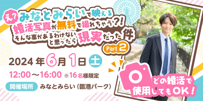 アニメやマンガ・ゲームなど趣味を愛するオタク層向けに特化した結婚相談サービスを展開するとら婚株式会社(代表取締役:吉田博高 以下、とら婚)は、とら婚 横浜オフィスで2024年6月1日(土)の12時より、プロカメラマンによる無料写真撮影イベント「え?みなとみらいで映える婚活写真が無料で撮れちゃう?!そんな事があるわけないと思ったら現実だった件【Part2】」を開催いたします。