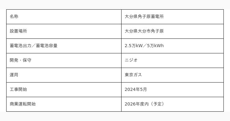 大分県角子原蓄電所は、一般社団法人環境共創イニシアチブが公募する「令和5年度系統用蓄電池等導入・配電網合理化等再生可能エネルギー導入加速化事業費補助金(系統用蓄電池等導入支援事業)」[*4]の採択を受け、ニジオが開発します。2026年度内の商業運転開始を目指しており、東京ガスが日本卸電力取引所や需給調整市場での市場取引を実施します。