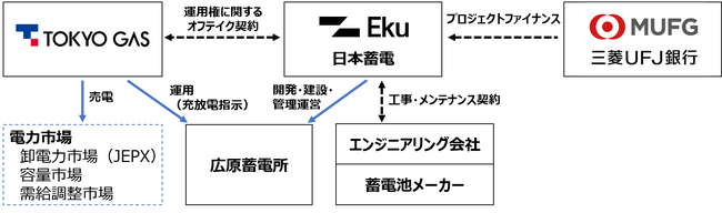 東京ガスは今回のオフテイク契約により、広原蓄電所の100%の運用権を20年間にわたり所有します。なお、広原蓄電所は、株式会社三菱UFJ銀行(取締役頭取執行役員:半沢 淳一、以下「三菱UFJ銀行」)による、同行として国内の蓄電所では初めてとなるプロジェクトファイナンス[*5]の組成を受け、日本蓄電が開発を進めています。