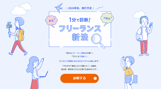フリー株式会社(以下「freee」)は、今年秋施行予定のフリーランス保護新法に向けて、受注者・発注者それぞれどんな対応が必要なのか診断できるサイト「1分で診断!フリーランス新法」を公開しました。本サイトでは、4つの選択式の質問に答えていくだけで、下請法・フリーランス保護新法の対象か診断します。また、具体的に発生する作業や注意点を解説します。