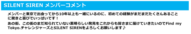 知っていると思っていた街が知らない街になっていたり、新しいおもしろいお店が次々と生まれたり、老舗が斬新なことを始めたり・・・少し足を伸ばすだけでいつでも楽しめるのが東京という街のすばらしさ。今回のムービーでは、SILENT SIRENの3人が演じる「Find my Tokyo.チャレンジャーズ」が、様々な街を巡りながら、東京の魅力をもっと発見していきたい、みんなで体験していきたいという気持ちを表現しています。