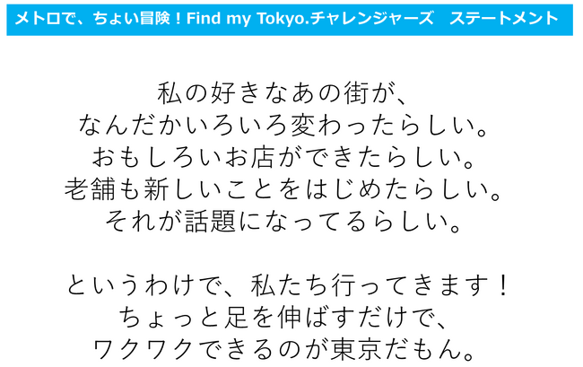 4月26日(金)よりスペシャルムービーを公開メトロで、ちょい冒険!「Find my Tokyo.チャレンジャーズ」
