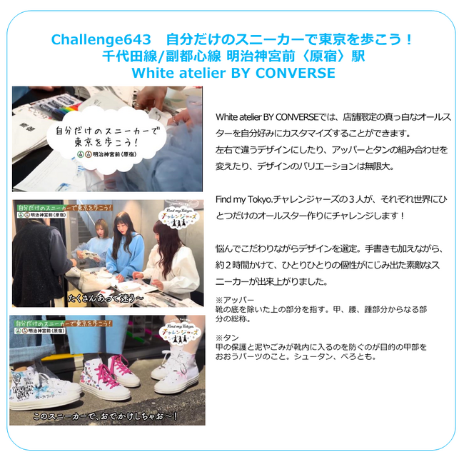 2024年度のチャレンジ動画第一弾では、 明治神宮前〈原宿〉駅のスニーカーづくりが体験できるお店をご紹介。SILENT SIRENメンバーが出演しているチャレンジ以外にも、特設WEBサイトでは300以上のチャレンジをご用意!