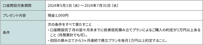 特典1 新規口座開設者さま限定 投資信託を3ヶ月間連続で積み立てたかたに現金1,000円プレゼント