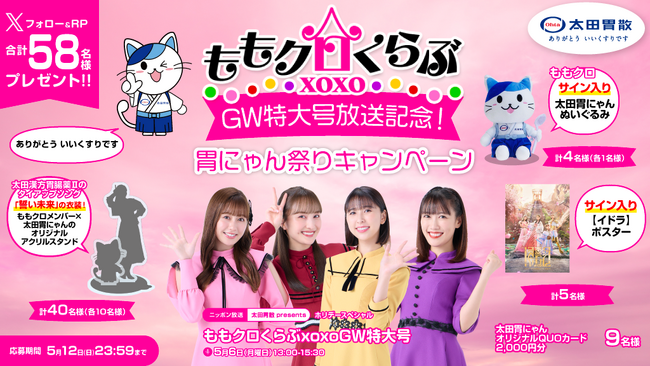 同社のニッポン放送「太田胃散 presents ももいろクローバーZ ももクロくらぶxoxo GW特大号」<パーソナリティ:ももいろクローバーZさん>の放送を記念しての企画となっておりますので、ぜひ番組とともにチェックしてください。