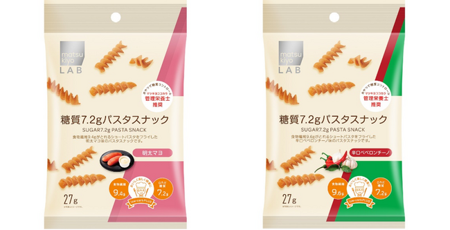 matsukiyo LABの「サステナブルロカボライン」から低糖質でも食べ応え十分な“濃厚味”の新フレーバー「パスタスナック」2種 5月11日より販売開始