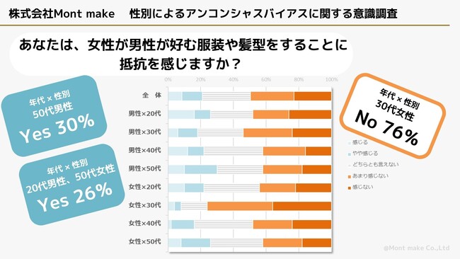 化粧品メーカーのスタートアップ、株式会社Mont make(本社:大阪府岸和田市、代表取締役社長:山本 篤)は、女性向け/男性向けの商品を異なる性である男性/女性が装い、自己表現をすること(クロスドレッシング)に対する意識調査を行いました。その結果、20代男性および50代男性に否定的な意識が高い傾向が、30代女性に比較的肯定的な意識が高い傾向がみられました。一方で「一人ひとりが思い描く美しさを目指すこと」を良いと思う人は全体で約70%にのぼり、目指す美しさは人それぞれであってよいという認識の広がりがみられました。