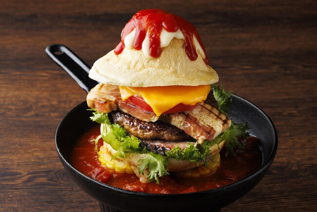 富士山に見立てオリジナルブリオッシュバンズに、「甲州ワインビーフ」のパティと「甲州富士桜ポーク」のベーコン、アメリカ産ハンギングテンダーのグリルなどを贅沢に挟んだバーガー。トマトスープをスキレットに注ぎ入れご提供し、スープにバーガーを浸してお召し上がりいただく新感覚スタイルをお楽しみいただけます。見た目のインパクトはもちろん、ピリッとスパイシーな美味しさを感じていただける夏の赤富士バーガーをお召し上がりください。