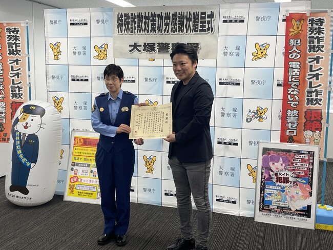 モバイルバッテリーシェアリング「ChargeSPOT(R)」を運営する株式会社INFORICH(本社:東京都渋谷区、代表取締役社長:秋山 広宣、以下INFORICH)は、文京区警察署(大塚警察署・富坂警察署・本富士警察署・駒込警察署)が実施する特殊詐欺被害防止キャンペーンにおいて、「ChargeSPOT」のデジタルサイネージ上で特殊詐欺被害防止を呼びかける動画の放映に協力をいたします。この取り組みに対して、5月16日に大塚警察署より感謝状を受領いたしました。