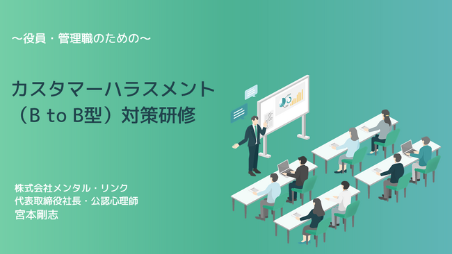 昨今話題のカスタマーハラスメント(カスハラ)。マニュアル等、様々な対策が広まりつつあります。多くのものは「B to C」企業向けで、エンドユーザーからのカスハラへの対策となっております。しかし、取引先や関連会社、グループ会社からのカスハラに困っている企業や管理職から相談を多くいただいております。そこで、株式会社メンタル・リンク(東京都千代田区、代表:宮本剛志、以下「当社」)は、B to B(企業 対 企業)型のカスハラに特化した対策プログラム(役員・管理職・担当窓口向け)を公開いたします。すでに複数の企業で研修を実施し、「とても参考になった」「早速、部下と共有しました」等の声が届いております。カスハラ対策は、退職防止等につながるという調査結果もあるように、企業として取り組む課題となります。B to B型のカスハラ対策で困った際には、当社にご相談ください。
