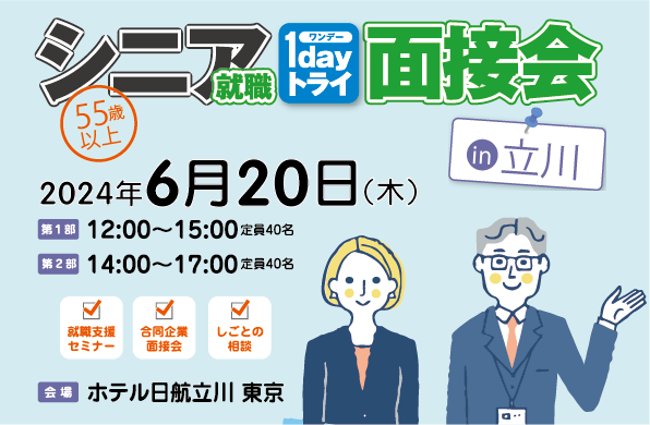 企業とシニア世代のマッチングを推進、就職を目指すシニア世代のためのイベント「シニア就職1dayトライ面接会in立川」を6月20日(木)に開催