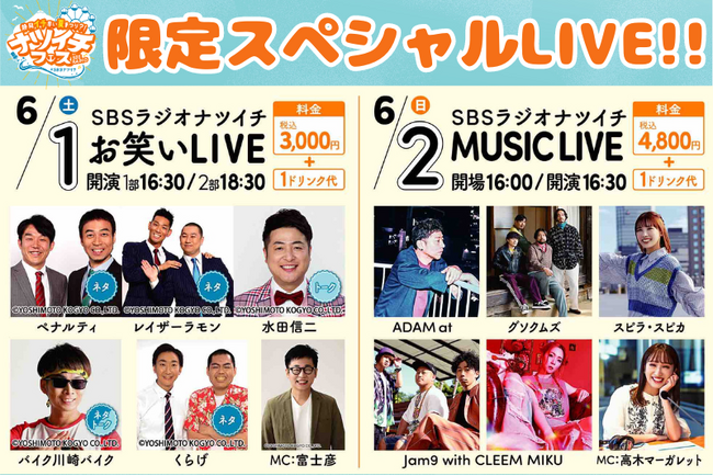 【チケット販売中】ペナルティ、レイザーラモン、BKBなど人気芸人&アーティストが大集合! 6/1(土)・2(日)、お笑い&音楽ライブ開催