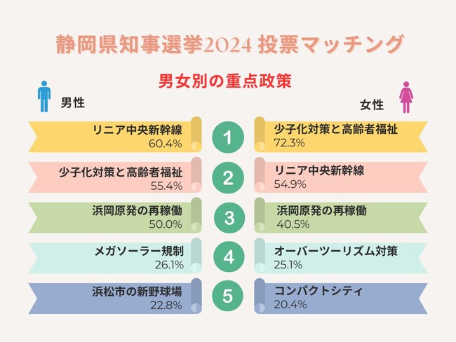 男女で関心を集めた上位3項目は「少子化対策と高齢者福祉」「リニア中央新幹線」「浜岡原発の再稼働」で共通していました。