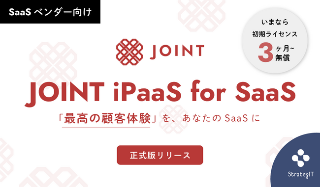 株式会社ストラテジット(本社:東京都港区、代表:加藤 史恵、以下「当社」)は、”SaaSのチカラをすべての企業に”をミッションにサービス展開するJOINTプラットフォームの「JOINT(読み:ジョイント) Products」より新プロダクトとして、SaaSベンダー向けのEmbedded iPaaS「JOINT iPaaS for SaaS」を正式にリリースいたしました。