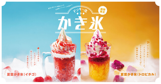 「暑くなるこれからの時期、お客様にひんやり涼んでいただきたい」という想いを込めて、果肉入りのイチゴソースをたっぷりとかけた「夏雲かき氷(イチゴ)」に加え、マンゴー氷に果肉入りのドラゴンフルーツソースをたっぷりとかけた「夏雲かき氷(トロピカル)」が初登場します。