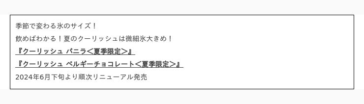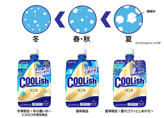 「クーリッシュ バニラ」、「クーリッシュ ベルギーチョコレート」については、季節に合わせて微細氷のサイズを変えています。夏季限定品質は、春・秋に使用している微細氷と比較しサイズが大きく、より強い冷涼感とシャリッとした食感が楽しめます。また、冬季限定品質については、春・秋よりも微細氷を小さくすることでマイルドな冷涼感と、よりなめらかな食感を楽しむことができます。