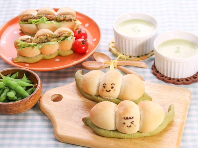 全国でも有数の出荷数を誇る群馬県の枝豆を使った、親子で楽しめる手作りパンとお料理の教室です。枝豆の形をした可愛らしいパンを作り、つくねを挟んで照り焼きドッグに仕上げます。持ち帰り用はチョコペンでお絵描きして、世界で一つだけの枝豆パンの出来上がり!