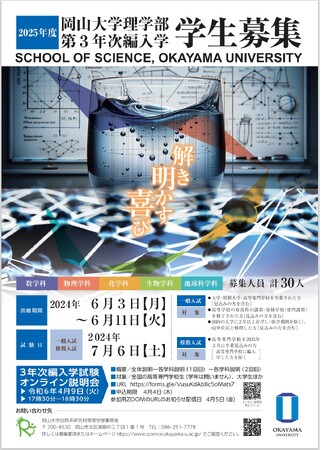 国立大学法人岡山大学(本部:岡山市北区、学長:那須保友)の理学部では、2025年度第3年次編入学の学生募集を以下の日程で行います。