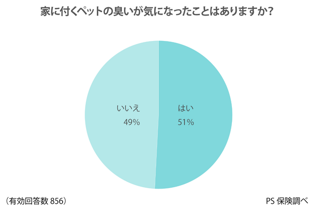 飼い主に「家に付くペットの臭いが気になったことはあるか」を聞いたところ、51%が「はい」と回答しています。「はい」と「いいえ」でほぼ半々ですが、ペットの臭いが気になる人のほうが若干多い結果となりました。