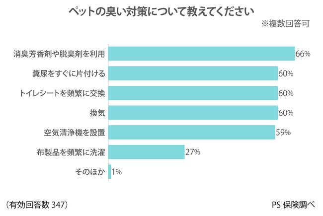 最も多く挙がったペットの臭い対策は「消臭芳香剤や脱臭剤の利用」(66%)。
