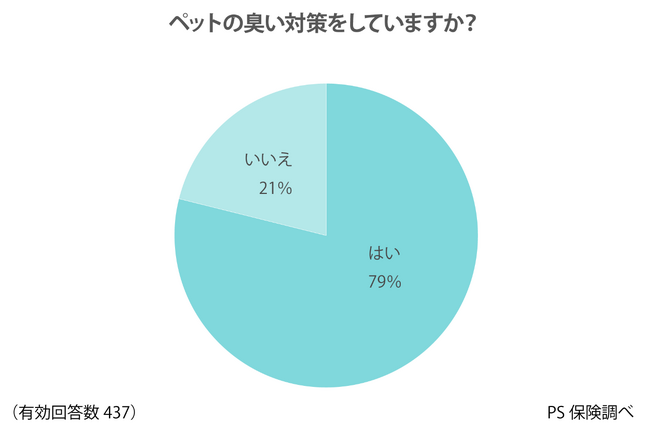 飼い主自身がペットの臭いを気にするだけでなく、来客にまで指摘されてしまうと、やはり臭い対策は欠かせないでしょう。ペットの臭いが気になる飼い主のうち、79%が実際に臭い対策をしていると回答しています。