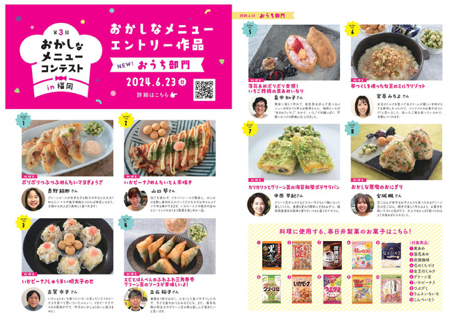 今年から「おみせ部門」に加え、福岡県内にお住まいの方ならどなたでも応募できる「おうち部門」を新設しました。 今年のお題は、春日井製菓の商品と、応募者が推す福岡らしい食材を使ったアイデア料理(スイーツ・デザートを除く)です。