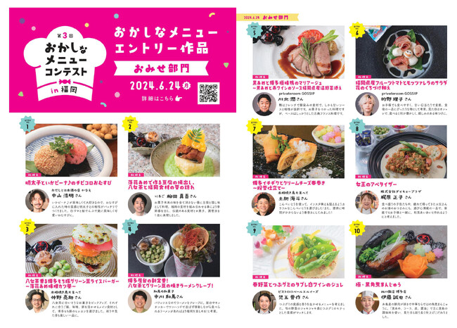 このアイデア溢れるメニューをメディアの皆様にもご体験いただきたく、今年も本選コンテストにご招待します。 第1回、第2回とも、福岡の飲食店で働く多くの方々やそのお店のお客様に喜ばれ、メディアにも数多く取り上げていただきました。おうち部門が加わった第3回は、プロの料理人とは違う発想力も見られますので、ぜひ取材にお越しください。