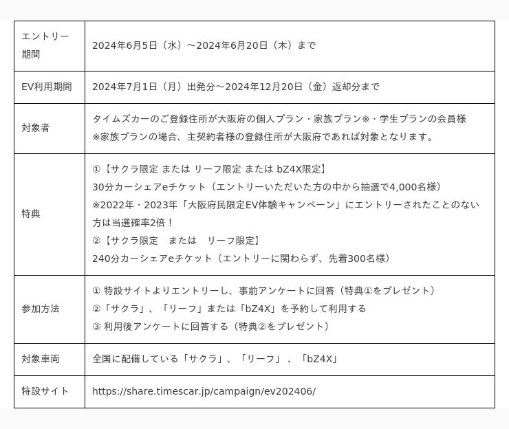 タイムズモビリティ株式会社(本社:東京都品川区、社長:川上紀文)は、2024年7月1日(月)から12月20日(金)までの期間、カーシェアリングサービス「タイムズカー」に入会されている大阪府在住の会員様限定でEVを体験いただけるキャンペーンを実施します。