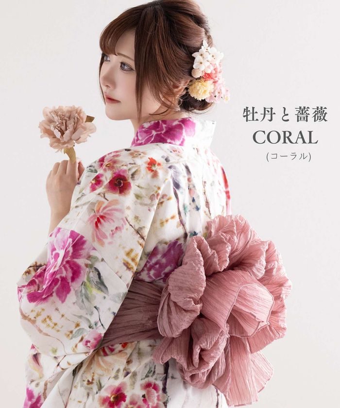 クラシカルでありながらモダンで美しい新作浴衣「牡丹と薔薇」のテキスタイルは、絵画のようで特別感にあふれるデザインで、着用される方の魅力を華やかに引き立てます。