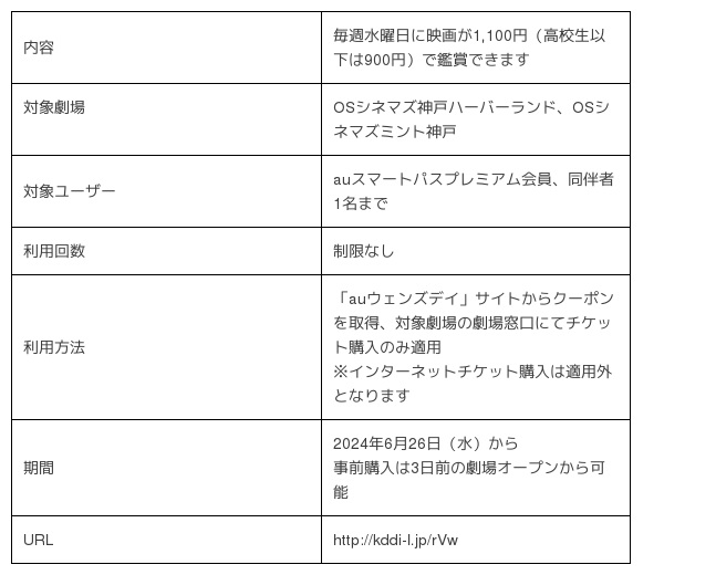 オーエス株式会社(本社:大阪市北区、代表取締役:高橋秀一郎(※1))は、経営するシネマコンプレックス「OSシネマズ」において、auスマートパスプレミアム会員・同伴者1名まで、OSシネマズ神戸ハーバーランド、OSシネマズミント神戸にて毎週水曜日に映画が1,100円(高校生以下は900円)で鑑賞できる「auウェンズデイ」を、2024年6月26日(水)から開始します。※対象劇場の劇場窓口にてチケット購入のみ適用、インターネットチケット購入は適用外となります。