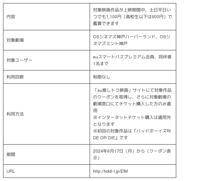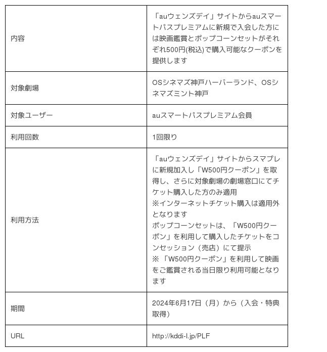 また、「auウェンズデイ」のサイトからauスマートパスプレミアムに新規入会した方を対象に、OSシネマズ神戸ハーバーランド、OSシネマズミント神戸で映画観賞とポップコーンセットがそれぞれ500円(税込)で購入可能となる「W500円クーポン」を2024年6月17日(月)から提供を開始します。