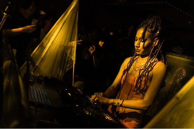 オープニングはRUIが担当した。完売公演とあって、フロアはどんどん埋まっていく。RUIはヒップホップ、グライム、ハウスなどさまざまなダンスミュージックを縦横無尽に選曲。洗練されているがダーティなプレイで観客の体温を上げていった。
