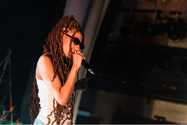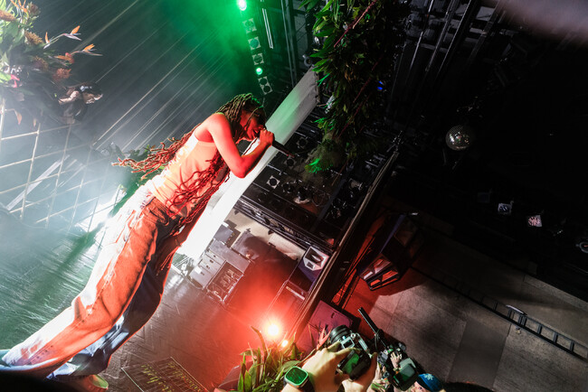 RUIのDJを1時間堪能したのち、MFSが登場した。ヴィンテージデニムに、白いコットンのタンクトップとシンプルなゴールドのアクセサリー。腰まで伸びたドレッドヘアにお馴染みのサングラス。ラフだけど上品。なのにリリックは飾らず、ラップも大胆。そのギャップとセンスが彼女の魅力だ。ライブは「BINBO」からスタート。圧巻の声量と滑舌ですぐに観客をバイブスをキャッチした。前半はアルバムの収録曲を中心に、代表曲「BOW」などをラップしていった。最初のゲストはJJJ。「Drink」と「Mirror」を二人でぶちかまして大歓声を巻き起こす。その後MFSは初のワンマンに来てくれたファンに「本当にありがとうございます」と感謝の挨拶をした。