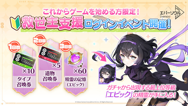 2024年7月3日(水)メンテナンス以降、初めて『エバーソウル』をプレイされる方を対象にイベント期間中はゲームにログインするだけで「タイプ召喚券」や、エピック精霊が手に入る「精霊の記憶」などを獲得できる「救世主支援ログインイベント」開始しました。最大でログイン3日目まで報酬が支給されますので、この機会に是非『エバーソウル』をプレイしてください。
