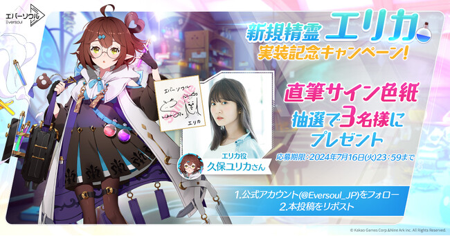 新規精霊「エリカ」の実装を記念して2024年7月3日(水)より「フォロー&リポストキャンペーン」を実施中です。『エバーソウル』公式X(旧Twitter)をフォローした状態で、該当キャンペーンポストをリポストした方の中から「エリカ」役を担当されている「声優:久保ユリカさん」の直筆サイン色紙を抽選で3名様にプレゼントします!