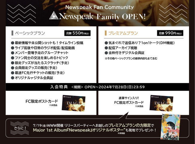 また、2024年 7月19日(金)渋谷WWWにて行われるリリースライブでは、プレミアムプランに入会した方限定で「Major 1st Album『Newspeak』オリジナルポスター」(非売品)も現地でプレゼント!