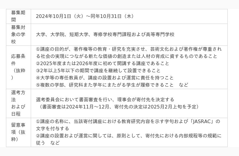 募集の概要は以下のとおりです。詳細は添付の募集要項をご確認ください。「寄付講座JASRACキャンパス」をご活用いただき、著作権に対する理解を深めるきっかけとしていただければ幸いです。