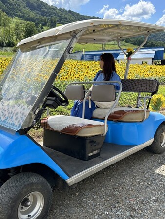 園では専用のゴルフカートのサポート(無料)で、ひまわり園の頂上の絶景ポイントまで一気に上がることができます。その後はゆっくりとゲレンデに咲くひまわりを見ながら散策をお楽しみください。