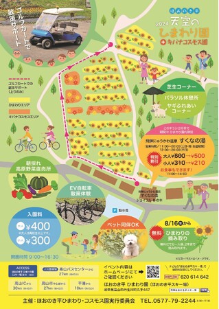 開園期間中は、どうぶつふれあい体験、朝採れ高原野菜の直売、ひまわりの摘み取り(8/16~)など様々なイベントも予定しています。ペット散策エリアもあるので、ペット同伴で楽しむこともできます。お帰りの際は、隣接する日帰り温泉施設「飛騨にゅうかわ温泉すくなの湯」で、ゆっくりお食事や休憩するのもいいですね!