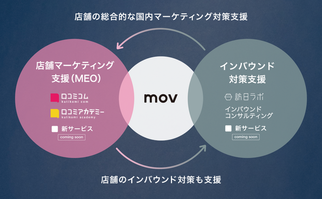 movは「日本のポテンシャルを最大化する」という使命を実現すべく店舗支援事業ではAI店舗支援SaaS「口コミコム」の運営、インバウンド支援事業では業界最大級のインバウンドビジネスメディア「訪日ラボ」の運営およびインバウンド専業のコンサルティングサービスを提供しております。