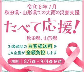 今回の大雨の災害で被災した「秋田県」「山形県」の農畜産物を多くのお客様に美味しく味わっていただくことで被災地を応援していただきたいとの想いを込めて、対象商品の送料をJAタウンが負担し“お客様送料負担なし”で販売します。
