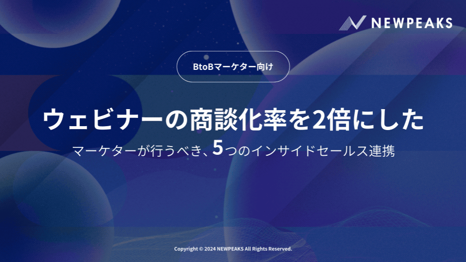株式会社ニューピークス(本社:東京都渋谷区、代表取締役:小林 慶嗣)は、新たなホワイトペーパー「ウェビナーの商談化率を2倍にしたマーケターが行うべき、5つのインサイドセールス連携」を発表しました。このホワイトペーパーでは、ウェビナーやカンファレンスにおける商談化率を劇的に向上させるための具体的な方法と事例を詳しく解説しています。