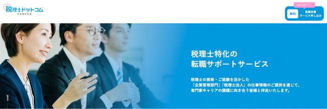 「税理士ドットコムキャリア」は、弁護士ドットコムキャリアで培ってきた弁護士・企業法務の専門人材の転職支援実績と、「税理士ドットコム(R)」スタートから2006年のノウハウ、ネットワークを活用した税理士に特化した専門人材紹介サービスです。即戦力となる専門人材(税理士)と企業・税理士事務所とのマッチングを実現します。