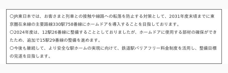 今後も部材の調達状況を見極めながら、鉄道駅バリアフリー料金制度を活用し、これまでお知らせしている整備目標「2031年度末頃までに東京圏在来線の主要路線330駅758番線の整備」の完遂を目指します。