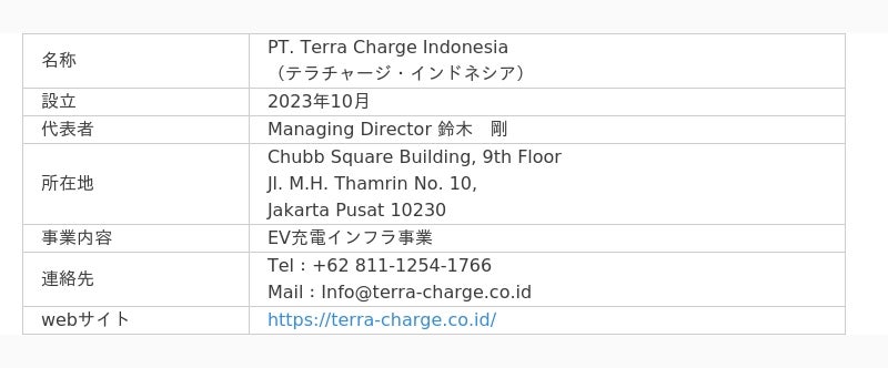 日本発グローバルEVベンチャーであるTerra Charge 株式会社(本社:東京都港区、代表取締役社長:徳重徹)は、インドネシア市場におけるEV充電インフラ事業を推進する、PT. Terra Charge Indonesia(本社:ジャカルタ、マネージング・ダイレクター:鈴木剛、以下「テラチャージ・インドネシア」)を設立し、EV充電サービス「Terra Charge(テラチャージ)」の提供を2024年8月20日より正式に開始いたしました。